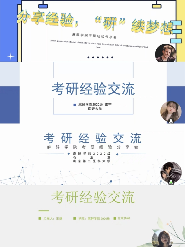 分享会开始阶段,由路鹏飞老师针对本校复试注意事项以及面试穿着进行专项讲解,提醒学生做好复试全流程准备;2025届毕业生、南开大学在读研究生雷宁学姐从面试着装、英语学习、面试技巧以及专业学习等多维度分享实用经验。雷宁结合自身复试经验,强调面试时需要注重自身陈述,遇到难以回答的问题时可以从麻醉前准备、术中管理和术后处理等方面结合实际经验进行阐述。在简历撰写上,雷宁学姐强调要避免大段陈述性文字,介绍自己时要突出重点,凸显自身竞争力;山东第二医科大学2025级研究生班长石玉童聚焦本校复试注意事项,介绍了本校考研的流程,结合历年考试内容以及自身考试经验分析考察重点,为学弟学妹们的复试准备指明方向。学长还引用了复试评委老师的寄语,鼓励同学们以扎实的专业功底和从容自信的心态迎接考验;2025届毕业生、协和医学院在读研究生王捷学姐则是从考试内容出发,强调了在实验复试中需牢记基本运算逻辑,明确老师考察重点,提示学弟学妹们把握备考难点重点。